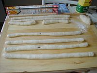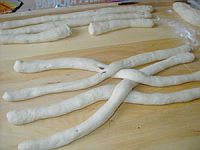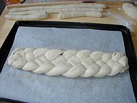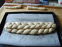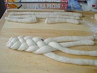 Vykynuté těsto jemně prohněteme a rozdělíme na 8 stejných dílů. Potom z nich vybereme ten, který se nám zdá přece jen větší a dáme jej stranou. Z ostatních dílů uválíme rukama stejně dlouhé válečky. Tři dáme stranou a ze zbývajících čtyř budeme splétat spodní díl vánočky. Válečky si položíme vedle sebe a splétání začínáme uprostřed tak, že nejdříve přehodíme dva vnitřní válečky, potom přidáme postranní a pleteme pravidelně až na konec pramenů. Druhou polovinu upleteme obdobně opět od prostředka vánočky. Konce válečků spojíme s stiskneme. Na pečící plech položíme papír na pečení a potřeme jej tukem (olejem). Přeneseme na něj spodní spletený díl vánočky a už na plechu ho uprostřed hranou dlaně trochu promáčkneme. To proto, aby se druhý díl mohl na spodní "pohodlně" usadit a při pečení nám náhodou "neujel" do strany. Druhé patro vánočky spleteme ze tří pramenů jako klasický cop a umístíme na spodní část vánočky. Opět hranou dlaně uprostřed podélně trochu promáčkneme a vytvoříme tak "místečko" pro vrchní část vánočky. Teď přijde na řadu odložený poslední díl těsta. Rozdělíme ho na polovinu a z každé uválíme váleček. Protože tyto válečky jsou již trochu tenčí, mohlo by se stát, že někde "vykukuje" kousek mandle nebo ořechu. To není příliš dobré, protože při pečení potom hrozí roztržení pramene. Doporučuji tuto mandli z těsta vyjmout a znovu uválet pramen. Oba hladké prameny se potom stočí, položí se do vytvořené rýhy a jejich konce se podtočí dospodu vánočky. V tomto okamžiku se docela šikovné, propíchnout vánočku alespoň třemi špejlemi (na obou koncích a uprostřed) - zabráníte tak případnému sesunutí pletence. Vánočku necháme ještě chvíli v teple kynout. (Pokud ještě nevíte, jak splétat čtyři prameny, lze je nahradit i klasickým copem ze tří pramenů, v tomto případě by ovšem měly být poněkud silnější).